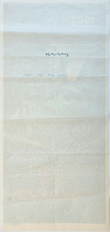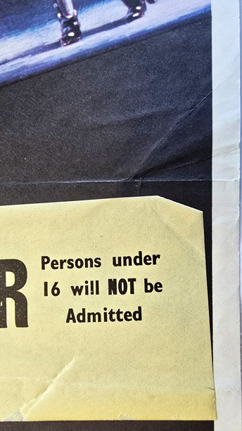 This highly sought-after daybill is in nice, albeit ‘theatre used’ condition, with the main points of note being a number of additional folds (easier to see in our image of the rear), a New Zealand ratings snipe has been added (the right corner has folded back and there is a score running through the lower area), the Australian rating has been blacked out and there is a tiny white spec printing imperfection to the upper right black area. Also, the title has been written on the rear twice (light bleed through of the darker one in the sky area – see close-up) and there are a couple of minor marks.