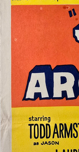 This highly sought-after Ray Harryhausen daybill is in wonderful unused condition. With the only points of note being, a couple of tiny edge tears, the usual handling creases (worse to the fold line/fold line ends), a light border mark to the right end of the upper fold line and the left of the red area has a couple of white specks where the print didn’t take. At some point, either at the time of printing, or later, someone has dabbed a couple of them with red marker. These spots are darker than the original red print and the dabs have bled through to the rear.