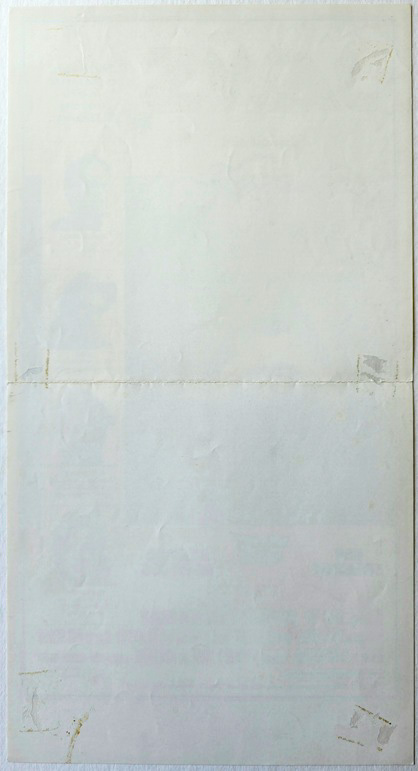 The only points of note with this ‘special’ sized promotional piece are the usual print wear to the central fold line (common on all folded posters of this era, light scattered handling creases and from previous theatrical display, the rear has 6 areas of old tape marks and patches of surface paper loss from its removal. This is only visible from the front when held up to the light. Also of note is that the lower showtime/snipe area is unused.