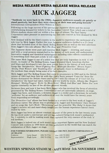 A rare local poster for Mick Jaggers one off 1988 New Zealand show in Auckland.