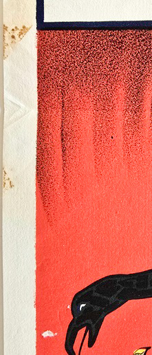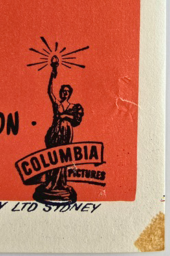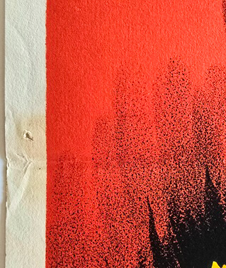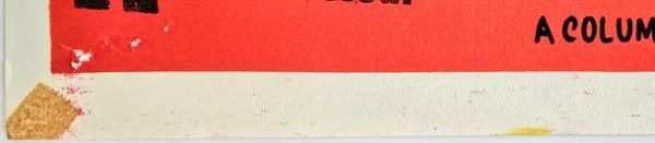 This incredibly daybill is in ‘theatre used’ condition and has the following main points of note: Old tape oil marks to the lower corners, having been folded for so many years, these tape stains have transferred to the borders just above and below the upper fold line ends (see close-up shots), although much of these could easily be matted/framed out. There are also numerous pin/staple marks to the corners and sides (the lower and central ones are within the red printed area – a number have torn), various handling/border creases and a number of handing marks to the upper border.