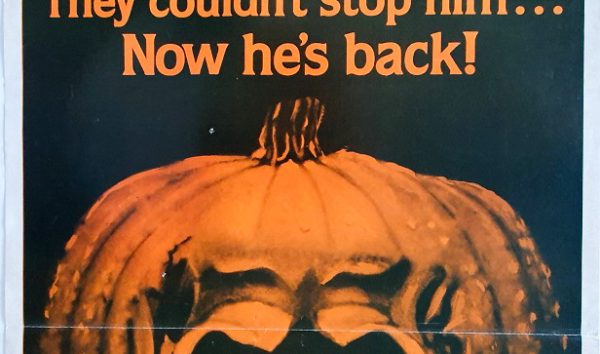 This rare daybill is in ‘theatre used’ condition, with the main points of note being a number of pin holes to the corners and a couple within the central artwork/pumpkin area – see white dots, fold line print wear/loss (common on all folded posters of this era), a number of print scuffs elsewhere (the worst to the lower fold crease lines), light handling creases, some darkening to the whiteness of the paper (the corner paper covered by the thumbtacks was spared this sun activated process) and a couple of marks/brown spots on the rear which lightly show through (the main one is to the Laurentis credit – the others are well hidden by the dark print).
