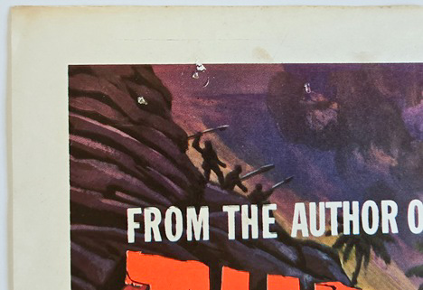 The main points of note with this ‘theatre used’ piece are a number of pin holes towards each the corners (most within the artwork/printed area) and a few others elsewhere. Some handling & fold line creases, doubling up/tram-ling to the upper sections of the left and right vertical fold lines, the same to the right half of the horizontal fold line, some border marks (including a small brown dot to the letter H in the left hand JOHN credit and there are some oily marks to the rear of the center (see close-up images of front and rear). A number of these small marks do bleed through to the front; however, the artwork does help to camouflage them from obvious attention. There are also a few other handling marks on the rear that don’t affect the front in any way.