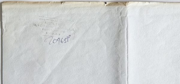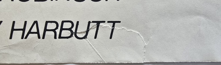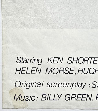 The main points of note with this rare ‘theatre used’ piece are tape to the corners, edge tears (the worst to the Sandy Harbutt credit), fold line/cross-fold creasing, some fold line tram-lining/doubling up, scattered handling creases, marks on the rear and the title has also been written on the rear (as well as some numbers) in pencil. A faint impression of this title can be seen from the front just below the upper left black Stone text (see close-up).