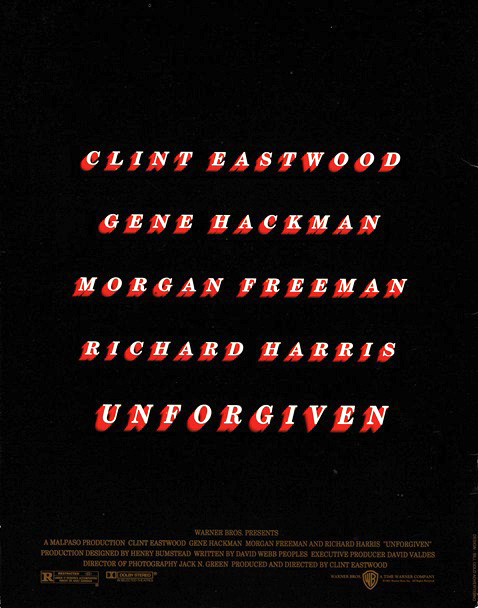 Retired Old West gunslinger William Munny (Clint Eastwood) reluctantly takes on one last job, with the help of his old partner Ned Logan (Morgan Freeman) and a young man, The “Schofield Kid” (Jaimz Woolvett).
